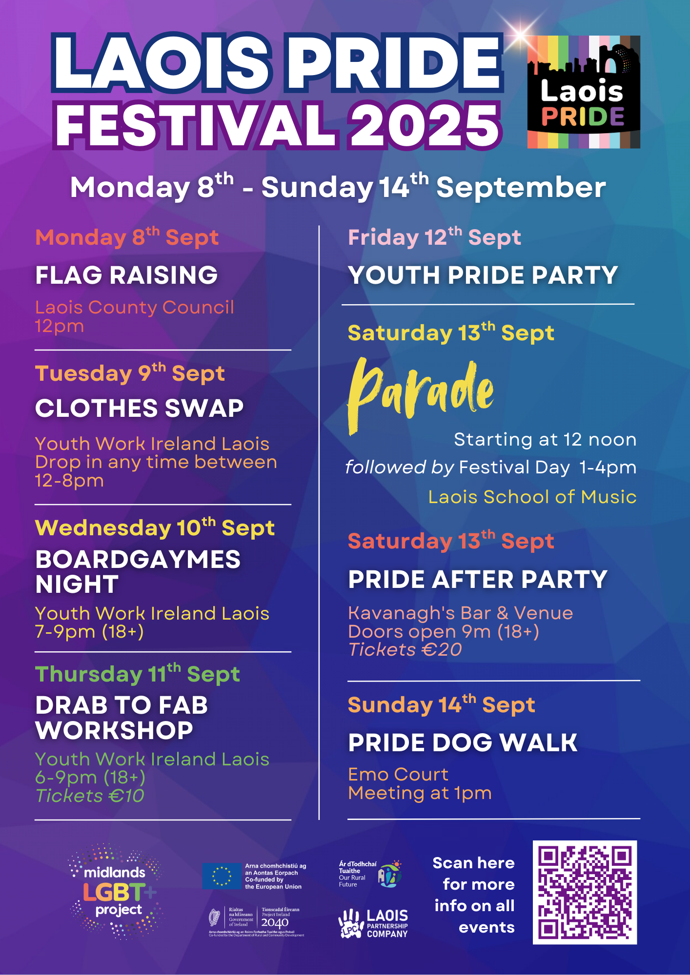 Laois Pride 2025 is fast approaching! Join us from the 8th-14th of September for our festival week, with an array of events to enjoy.